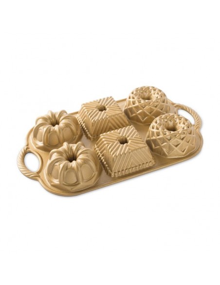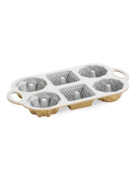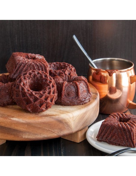Molde de aluminio fundido para bundts. Medida aprox de cada cavidad: 8,8 cm de Ancho x 8,8 cm de Largo x 3,8 cm de Alto. La marca Nordic Ware se caracteriza por ser una marca premium en el mercado. Fabricante líder de productos innovadores, con diseños únicos y exclusivos.