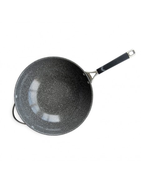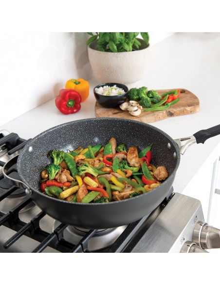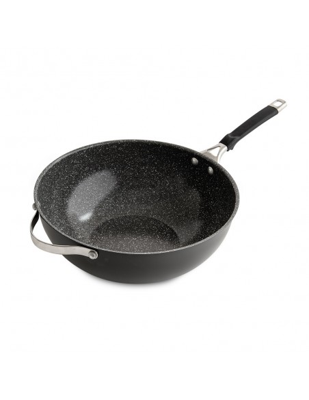 Wok de acero aluminizado con revestimiento antiadherente de cerámica. Además, está fabricado sin PFAS, PTFE ni PFOA. Equipado con un mango remachado de silicona que mantiene el frío para un agarre más seguro. Su superficie lisa y su fondo redondeado permiten una distribución eficiente del calor y técnicas óptimas de salteado . Las paredes profundas del wok brindan un amplio espacio para revolver y dar vuelta verduras , carnes y otros ingredientes con facilidad. La superficie antiadherente reduce la necesidad de aceite excesivo , lo que promueve una cocción más saludable al tiempo que preserva los sabores de sus platos favoritos.