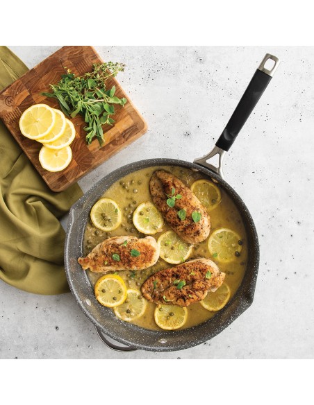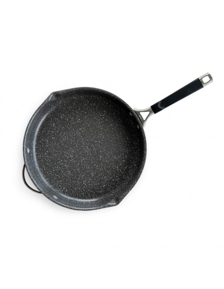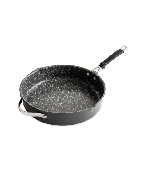 Cazo de acero aluminizado con revestimiento antiadherente de cerámica de 3 capas. Además, está fabricado sin PFAS, PTFE ni PFOA. El pico vertedor agrega comodidad, mejorando la simplicidad de uso de este producto. Permite verter fácilmente y reduce la probabilidad de derrames o suciedad. Equipado con un mango remachado de silicona que mantiene el frío para un agarre más seguro.