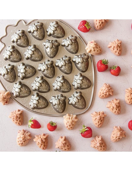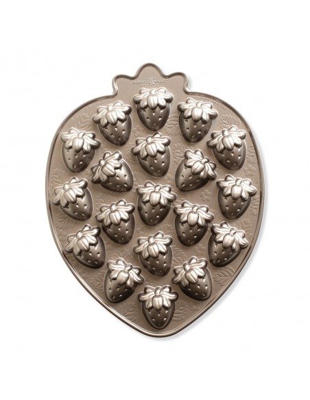 Molde de aluminio fundido. Dimensiones de las frutillas: 5.5 cm de largo x 5 cm de ancho x 2.7 cm de alto. Antes del uso inicial y después de cada uso posterior, lavarlo con agua tibia y jabón. No utilizar utensilios de metal, estropajos ni limpiadores abrasivos sobre la superficie. Nordic ware se caracteriza por ser una marca premium en el mercado. Se trata de un fabricante líder de productos innovadores, con diseños únicos y exclusivos.