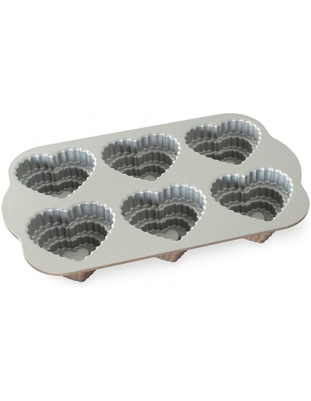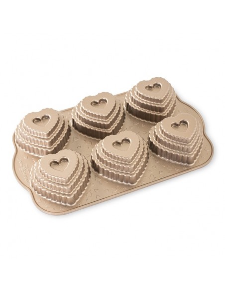 Molde de aluminio fino con forma de corazones. Medida aprox de cada cavidad: 8 cm de Ancho x 7,5 cm de Largo x 4 cm de Alto. La marca Nordic Ware se caracteriza por ser una marca premium en el mercado. Fabricante líder de productos innovadores, con diseños únicos y exclusivos.